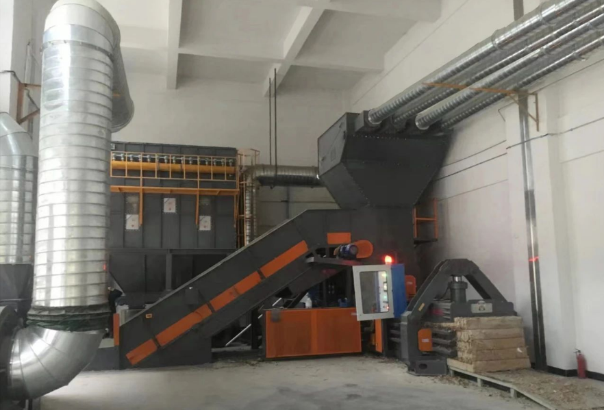 纸板车间清废项目采用传统T字型设计,纸板线修边废料通过管道为导向传送至打包机压缩打包,并连接版式分离器和布袋脉冲除尘系统,有效降低粉尘污染,提高废纸回收打包的经济效益。大块废纸无需破碎直接通过输送带输送到打包机打包。布袋除尘系统采用市场上目前先进的脉冲原理,可保证现场粉尘除却率达到 99%以上,清灰能力强,除尘精度高。